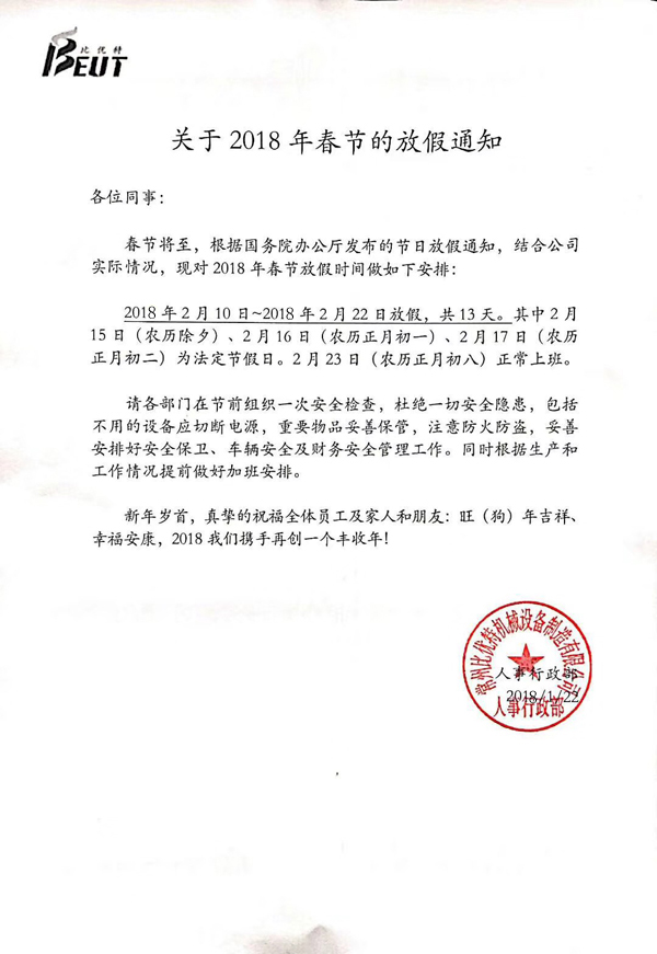 閱讀次數(shù):2801【中國機(jī)床商務(wù)網(wǎng)欄目 名企在線】神犬續(xù)天雞,九州吟雪尤吟歲;新春臨大節(jié),萬眾拜年喜迎新。金雞司晨去歲已逝,忠犬守夜喜迎新年。值此普天同慶、萬眾共賀之際,常州比優(yōu)特機(jī)械設(shè)備制造有限公司(以下簡稱“常州比優(yōu)特”)攜全體員工祝愿機(jī)床行業(yè)辛勤工作的全體同仁、給予了比優(yōu)特巨大支持的新老用戶以及合作伙伴在新的一年里一帆風(fēng)順、萬事如意、闔家團(tuán)圓、幸福美滿。